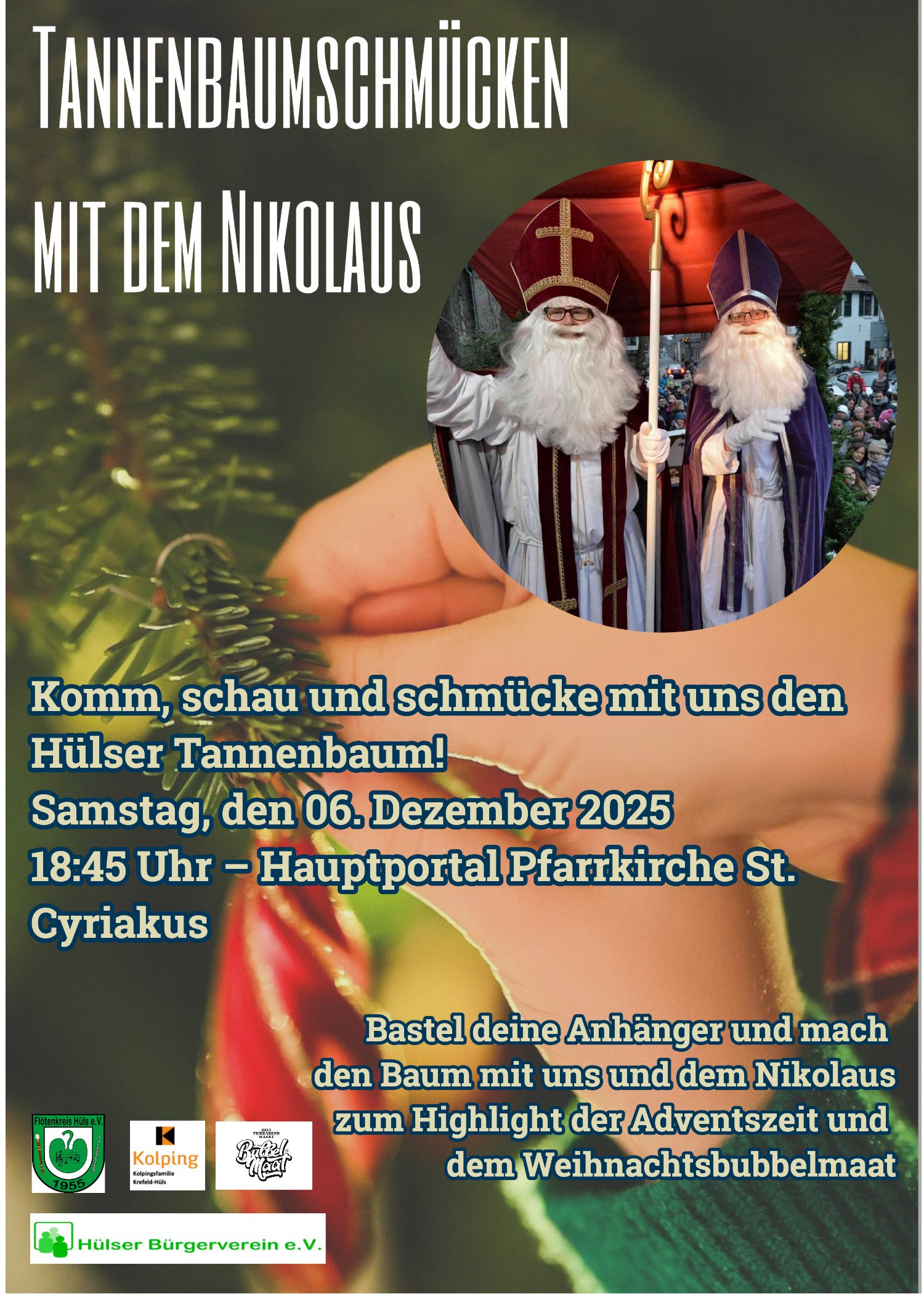 Der Hülser Nikolaus von der Kolpingsfamilie kommt vorbei – und ihr seid alle eingeladen, gemeinsam mit ihm den großen Tannenbaum auf dem Hülser Markt zu schmücken!